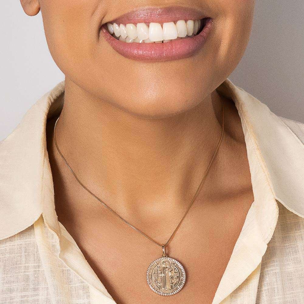 El dije de medalla de San Benito es reconocido por su poder protector y su significado espiritual. Con el agregado de circonias y el enchapado en oro 18K, esta pieza adquiere un brillo único que realza su importancia religiosa y su belleza estética.