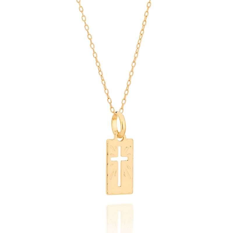 Este dije plaquita de cruz pequeña enchapada en oro 18K combina un estilo minimalista con la fuerza simbólica de la cruz. La plaquita rectangular, con la cruz calada en el centro, aporta un toque de sobriedad y elegancia, ideal para quienes desean llevar un accesorio discreto pero significativo.