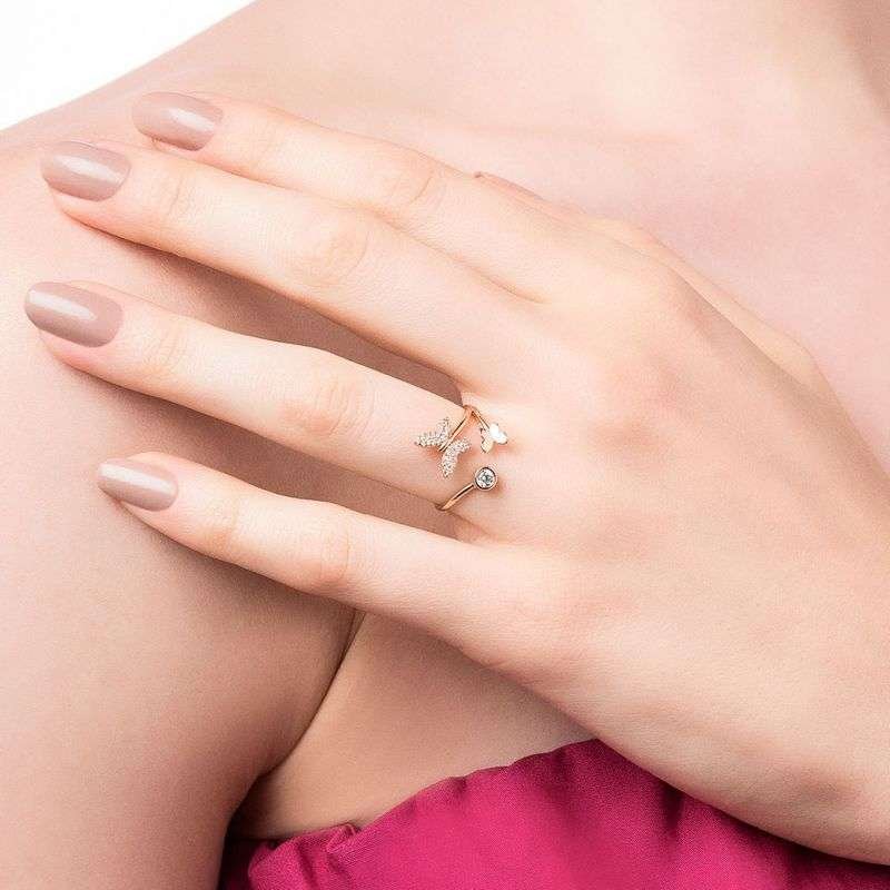 Esta sortija skinny con mariposas y circonias enchapada en oro 18K presenta un diseño aéreo y femenino. Una mariposa grande, engastada con pequeñas circonias, se alza sobre una varilla curva de oro, mientras que una mariposa más pequeña y pulida descansa en el extremo opuesto. A su lado, una circonia redonda en chatón aporta un punto de luz preciso. El aro abierto permite un ajuste suave, brindando comodidad y versatilidad para adaptarse a diferentes diámetros de dedo o usarse como sortija midi.