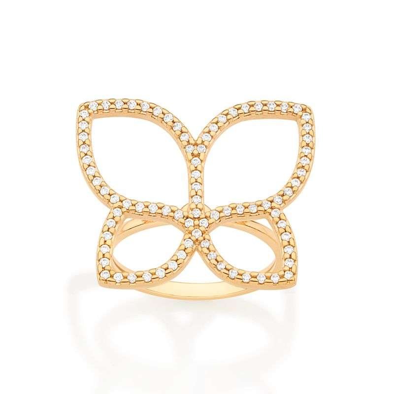 Esta sortija maxi mariposa con circonias enchapada en oro 18K presenta una silueta grande de mariposa calada, cuyos bordes se recorren con circonias de talla brillante. El diseño combina la ligereza visual de la estructura abierta con el lujo de las piedras engastadas, creando un accesorio de gran impacto que aporta sofisticación y brillo.